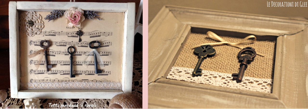 Se possedete chiavi antiche, con motivi pregiati, perchè non realizzare decorazioni da parete? Ridipinte e accostate alla cornice di alcuni quadri abbelliranno le stanze in maniera sfiziosa.