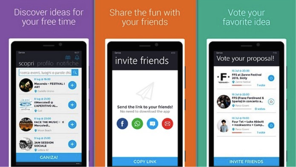 Gli inviti possono farsi tramite Messenger, Whatsapp, mail, sms o tramite link e le votazioni per le proposte preferite possono essere fatte anche senza possedere Ganiza tramite pagina web.